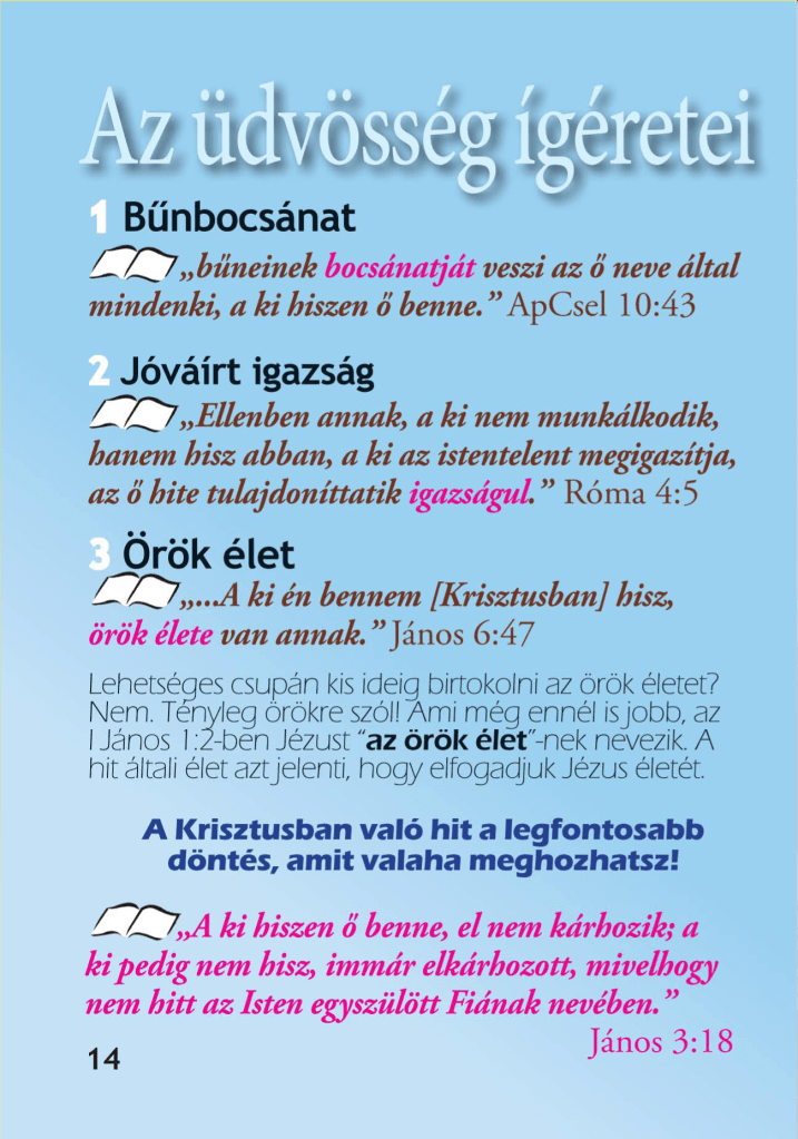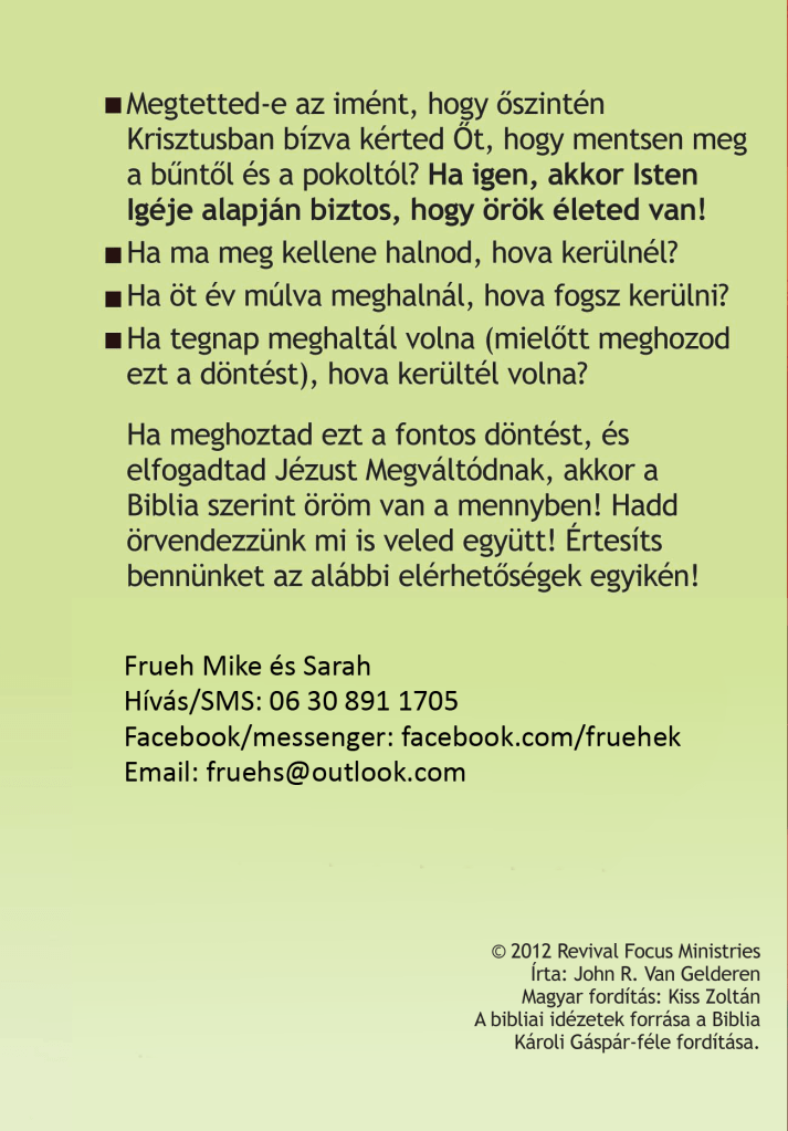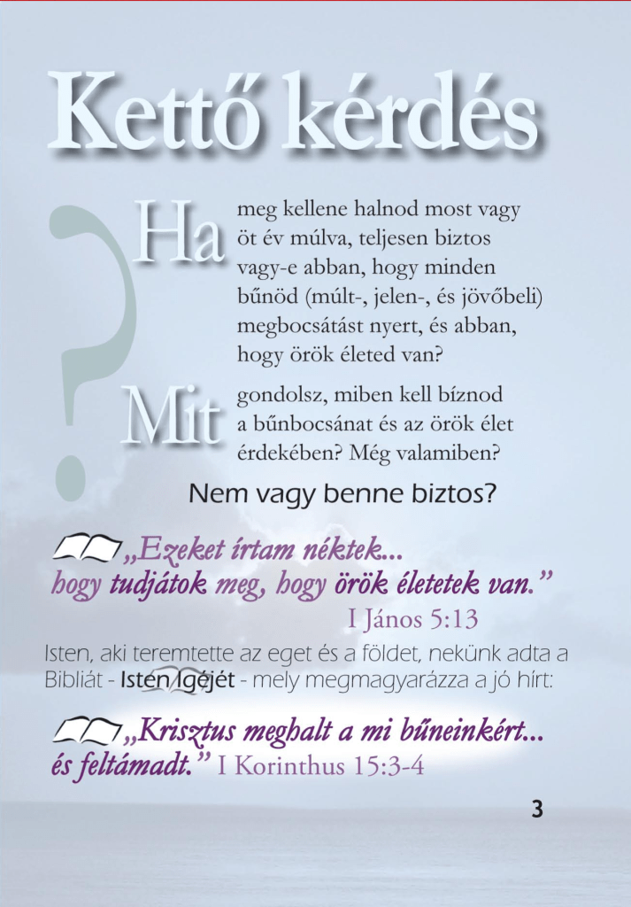 Hogyan lehet örök élet? “Az Isten kegyelmi ajándéka pedig ÖRÖK ÉLET a mi Urunk Krisztus Jézusban.” – Róma 6,23 – Hogyan tudhatom biztosan, hogy örök életem van?Kattints át ezen az előadáson!